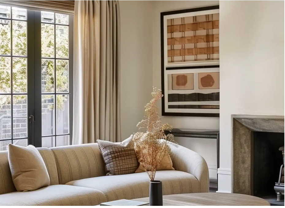 Parisian Modern: Một chút lãng mạn Paris với gương khung vàng và rèm mềm mại, khiến căn phòng bừng lên vẻ tinh tế.