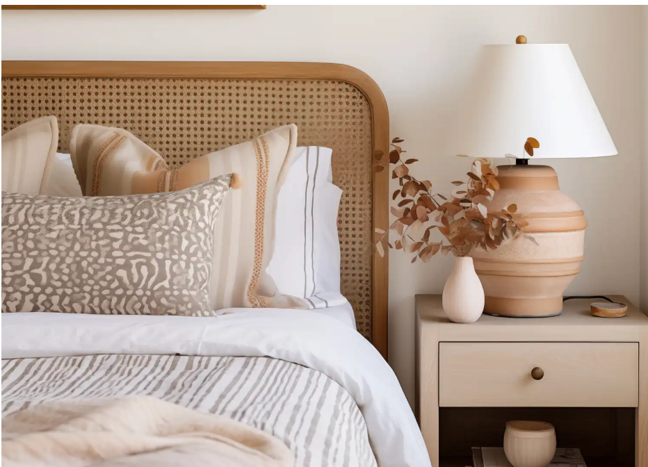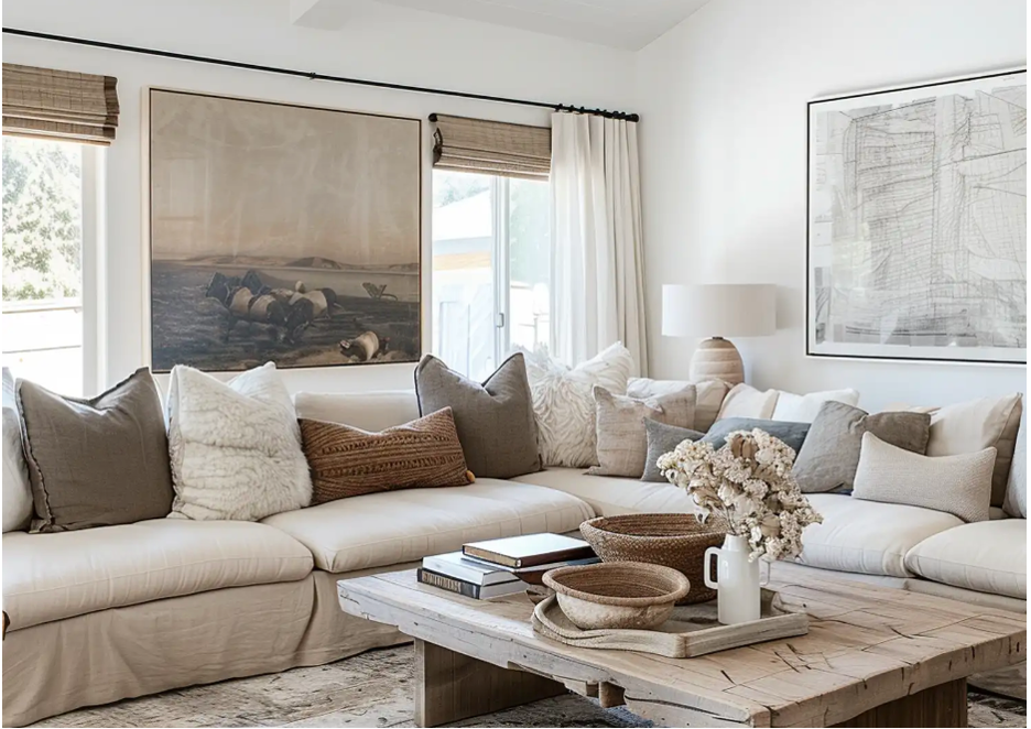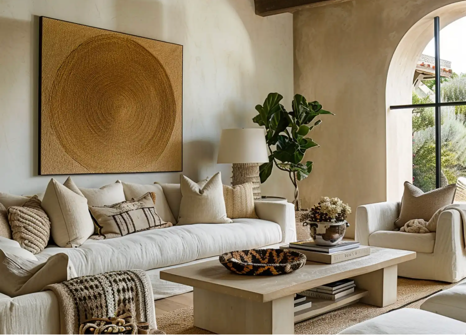 Vật liệu quen thuộc là vải linen thoáng mát, gỗ sồi sáng màu, mây tre đan tự nhiên, gốm thủ công và thảm cói hoặc jute, tất cả cùng tạo nên bầu không khí tự do và thư giãn đậm chất California.